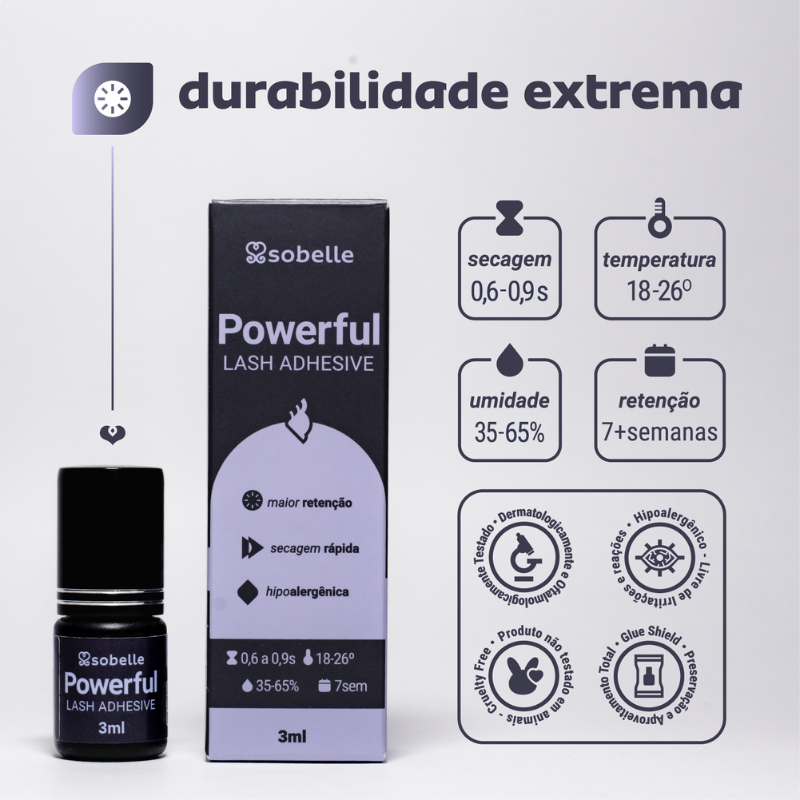 Glue Shield: Proteção máxima antes da primeira gota! A nova cola Powerful possui tecnologia exclusiva. Um sistema de proteção a vácuo, que preserva a embalagem e a integridade da fórmula até o momento de abertura da cola. A ciência por trás da sua confiança.